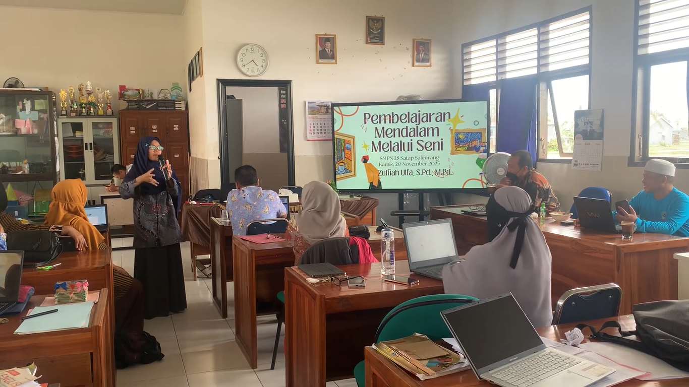 Salenrang, 20 November 2025. SMP Negeri 28 Satap Salenrang melaksanakan kegiatan diseminasi hasil Bimbingan Teknis Pembelajaran Mendalam melalui Seni pada hari Kamis, 20 November 2025, bertempat di ruang guru. Kegiatan ini dipandu oleh Zulfiah Ulfa, salah satu peserta Bimtek Angkatan I yang diselenggarakan oleh BBGTK Sulawesi Selatan yang berlangsung di Makassar pada tanggal 16–19 November 2025. Diseminasi ini bertujuan untuk menyebarluaskan konsep dan praktik pembelajaran berbasis seni kepada seluruh guru di sekolah.